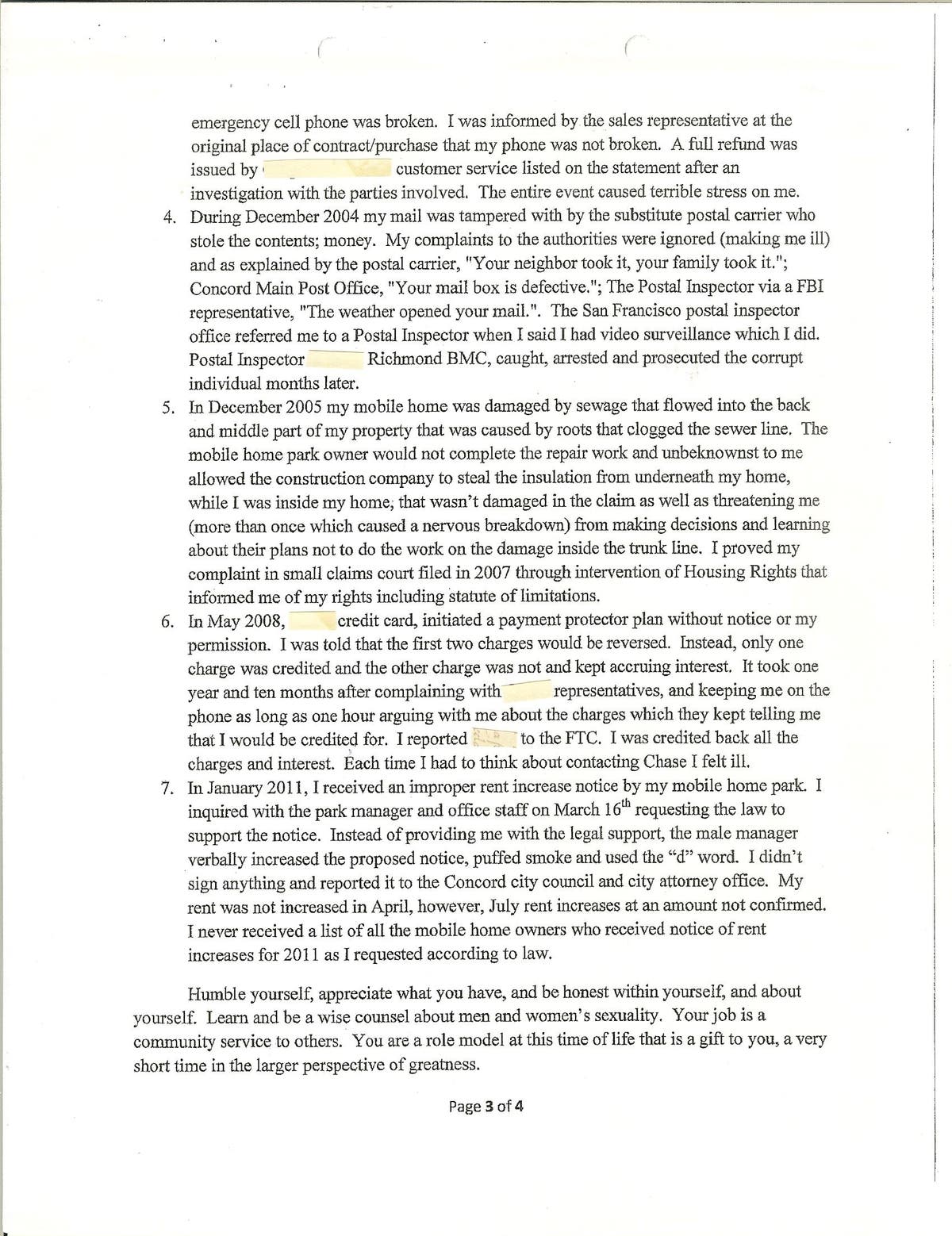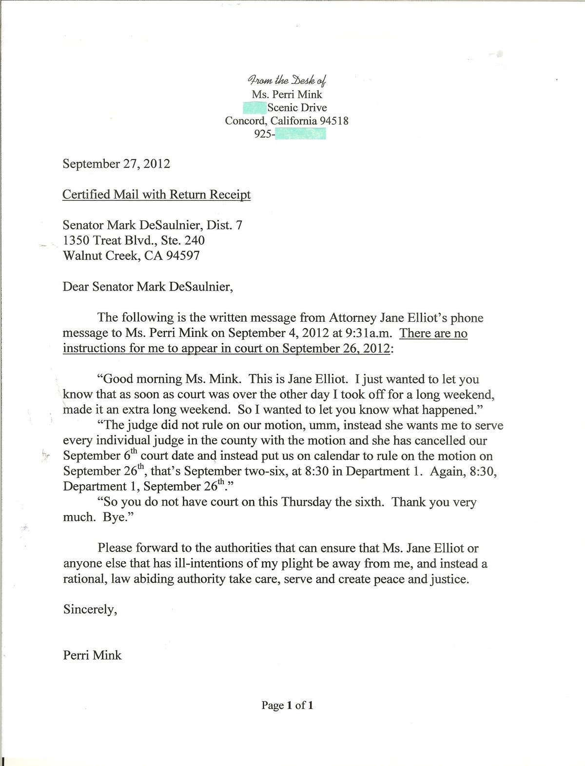 I had recorded the message and I currently can not find it. As many already know, my personal property was taken over, ransacked, damaged, stolen, and I am left with what I have. I again was desperately trying to protect myself from the terrorist acts of the legal system and wrote another letter to my representative Senator Mark DeSaulnier on September 27, 2012 because Jane had set me up again and in fact, Jane did not inform me that I must be at the court hearing on September 26, 2012. Senator DeSaulnier did not stop them. (Copy of my computer documented letter to Senator DeSaulnier):