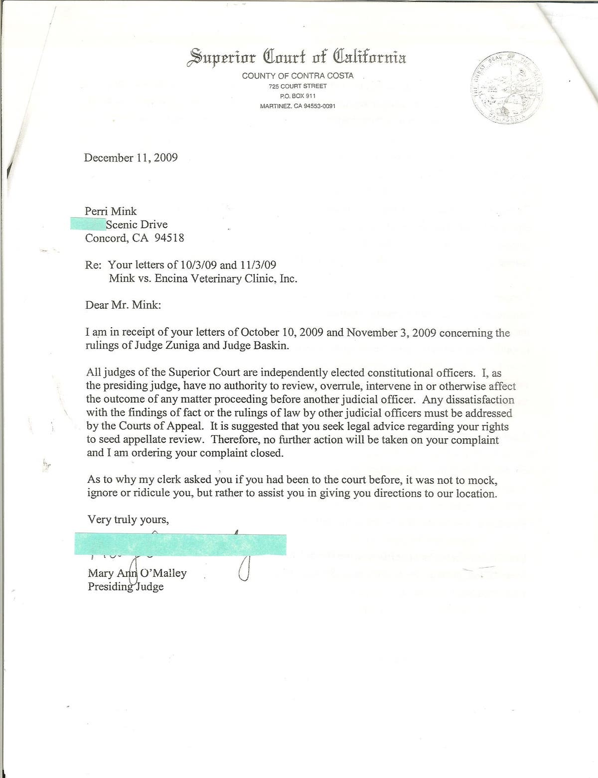 When I was representing myself, I was respectful to Judge Zuniga, Commissioner Judith Sanders, the court clerks, bailiffs, and law enforcement and I was following the law as described in the law books. It was unbeknownst to me that, in fact, they were conspiring to destroy me, and they did, by their opportunistic greed, using their job titles, and Security Clearances. It was unbeknownst to me at the time that Barbara, as a person, was obsessed with me, so much, that she couldn't stop making decisions about my case even after she was automatically disqualified as a judge. I had sent complaint letters to Presiding Judge Mary Ann O'Malley and she responded by committing illegal acts of Deprivation of Civil Rights, as evidenced in her letter dated December 11, 2009, and "closed" my Rights on me. Another bizarre response they make is, "no further action will be take", as evidenced. The Commission on Judicial Performance (CJP) woman responded to my official complaint this way too. I asked, "What action (disciplinary action) did you take?" since there was already "further action". I had also wrote about a mocking incident with a woman clerk and PJ O'Malley responded to my reporting in my letter by denying my complaint about that issue too. Unbeknownst to me at the time, I had also been given bad information by a woman when I had called the courthouse that I could go to PJ O'Malley's office in the A.F. Bray Courthouse on Ward Street, Martinez, California. What they (the gov court people) don't tell the public, media or investigators, is that they have a peculiar tone of voice, a snide behavior that can't be described fully except to use the words, mock, ridicule, make-fun-of, give-the-run-around, deny, exasperate, antagonize, etc... And these legal system women keep denying that they are behaving that way. But here is more evidence that PJ O'Malley lied in her letter to me. (Redacted copy of a copy of the original letter from Presiding Judge Mary Ann O"Malley below):