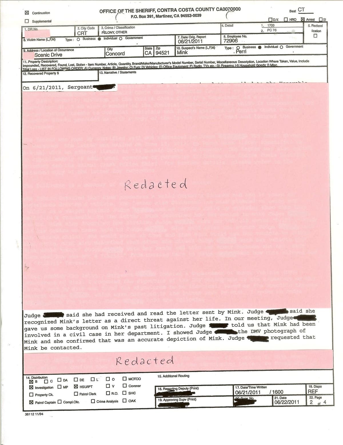 In the report from the Sheriff's Department, Judge Zuniga admits that she knows who I am, that she recognizes my physical appearance from my DMV photo, that she can talk about my civil case and she did, and that she was the hearing judge in my case. She falsely claims that my four page letter, that was also sent to 10 other government agencies, and individuals, which are: the Commission on Judicial Performance(CJP), Judicial Counsel of California Administrative Office of Courts, The State Bar of California, California Veterinary Medical Board, Mark Peterson District Attorney, Steve Bolen, Deputy District Attorney, Walnut Creek Police Chief, Joel H. Bryden, Lewis Brisbaard & Smith, LLP (Defendant's law firm), Wood, Smith, Henning & Berman, LLP (Defendant's law firm), Jackson & Wallace, LLP (Defendant's former law firm), is a threat to her life. Clearly indicating that their is a conspiracy to cover-up my case Mink v Encina Veterinary Clinic, Inc. et al. Never do any of them mention pages 2 and 3 which is directed to Judge Barbara Zuniga, but instead omit pages 2 and 3. Were they having sex with one another? How many are Catholic?, because Catholics teach to torture, steal, cover-up, and deny. Are any of them having sex with Dr. Roger Johnson or any of the other veterinarians or staff there? Are they relatives? Do they have stock in veterinary medicine? (Redacted copy of my copy of the Contra Costa County Sheriff's Department Report, page 2 below):