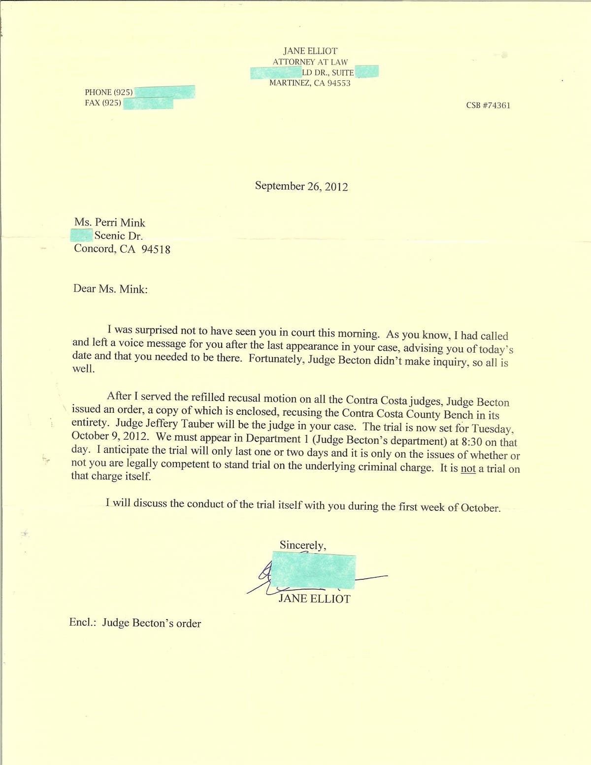 In addition to the evidence included with Part 2 Patch article, "Judges practice their Catholic upbringing in Court: A Cruel Trap", I received a letter, dated September 26, 2012, from attorney Jane Elliot expressing her surprise that I wasn't in court and then she lied saying that she said that I needed to be there. Since July of 2011 when she was assigned to represent me, she has done nothing but behave bizarre, condescend, degrade, harass, mock, lie about me, slander me, sexualize me, and talk about me behind my back to the judges without protecting me or explaining to them who I am or factually stating that the charge of threatening an official is ludicrous and that I should have never been arrested or charged because I didn't commit any crime. (Scanned copy of attorney Jane Elliot's letter dated September 26, 2012):