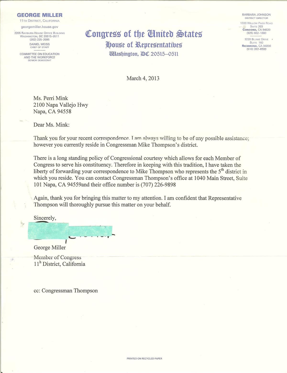 When I was kidnapped for the second time on October 12, 2012, when Presiding Judge Diana Becton did me in, and two different Sheriff Deputies cuffed me and drove me to the Martinez Detention Facility and then the next morning transported me with other arrestees to WCDF, I continued to hand write letters to my representatives, to federal law enforcement, media, and lawyers in pencil and when they forced me to NSH I wrote in pen, which were their rules. I was experiencing continuing traumatizing effects of the barbaric acts perpetrated on me by the Cruel Court since the first time I was arrested in June 2011, and I was SHOCKED and disturbed at the bizarre, callous and inhumane response I received from my representative Congressman George Miller, and that he forwarded my letter to Congressman Mike Thompson because, as he states, I reside at Napa State Hospital. I did not reside at Napa State Hospital, my home is in Concord California and I had written to him desperately explaining to him about the destruction acts of the legal system. There were only a few more weeks before my property would be taken away. He cared less about his community and country. Apparently he prefers a Third-World, Commie, Nazi-type, cult-like, mafia-style country too. (Scanned copy of U.S. Congressman George Miller dated March 4, 2013):