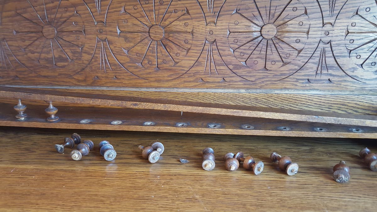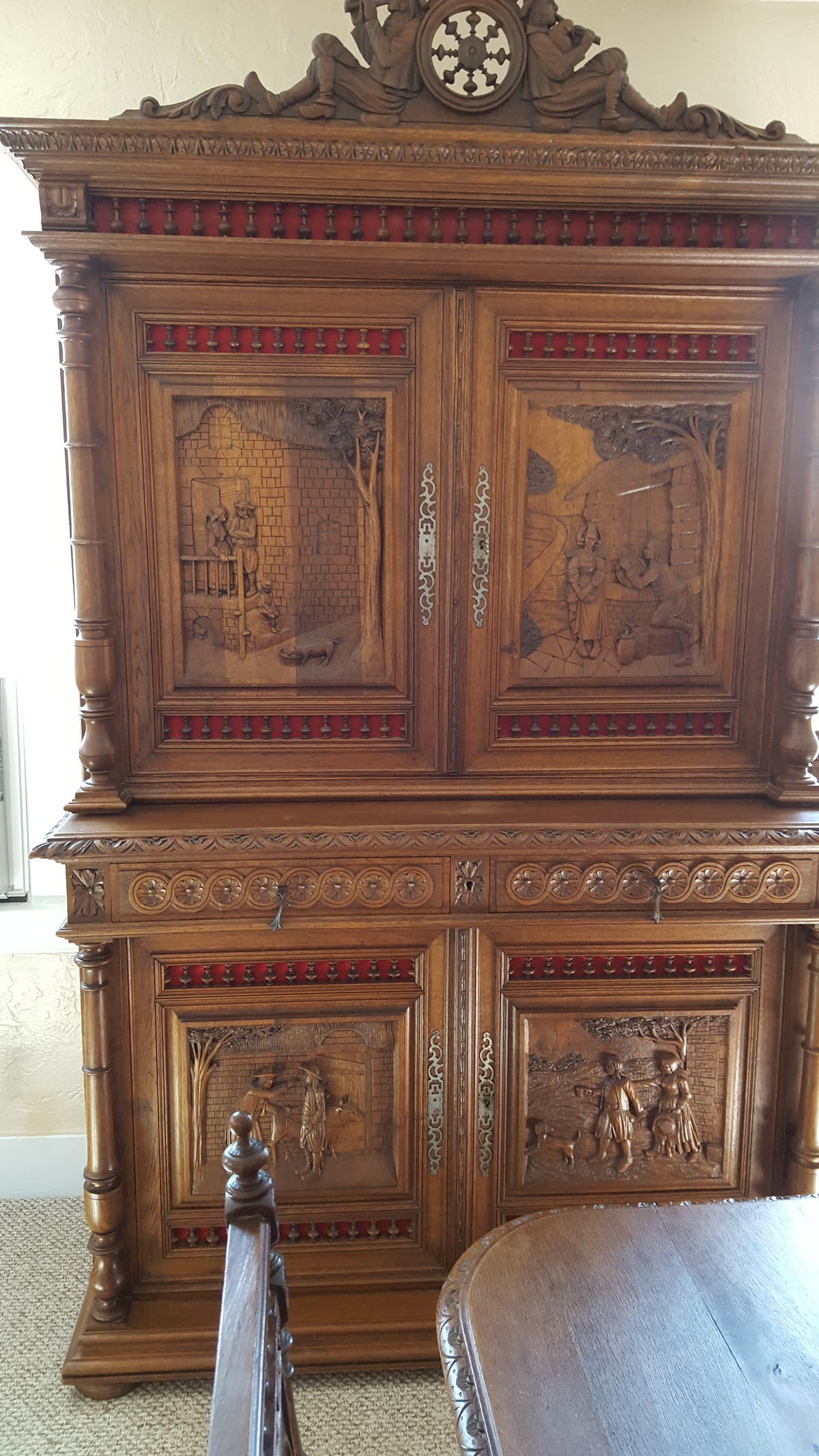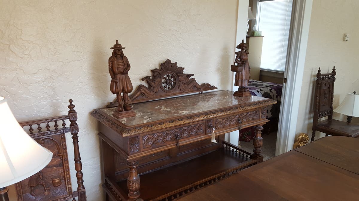 Below are photos of what's left of my antique historical French Brittany (Breton) buffet/hutch and tea server. The vile gov people stole one set of the beautifully hand carved people that attaches to the middle part between the buffet and hutch, and stole the top of the tea server where the two remaining hand carved people would be attached to, not including the pediment, of the exquisitely wood carved furniture that depicted the era of the Breton people with a Christian theme. I purchased this gorgeous and life-of-the-Breton-people furniture with the increased sale of my condominium because I completed home improvements myself with products that I bought at discount and at sales over several years.