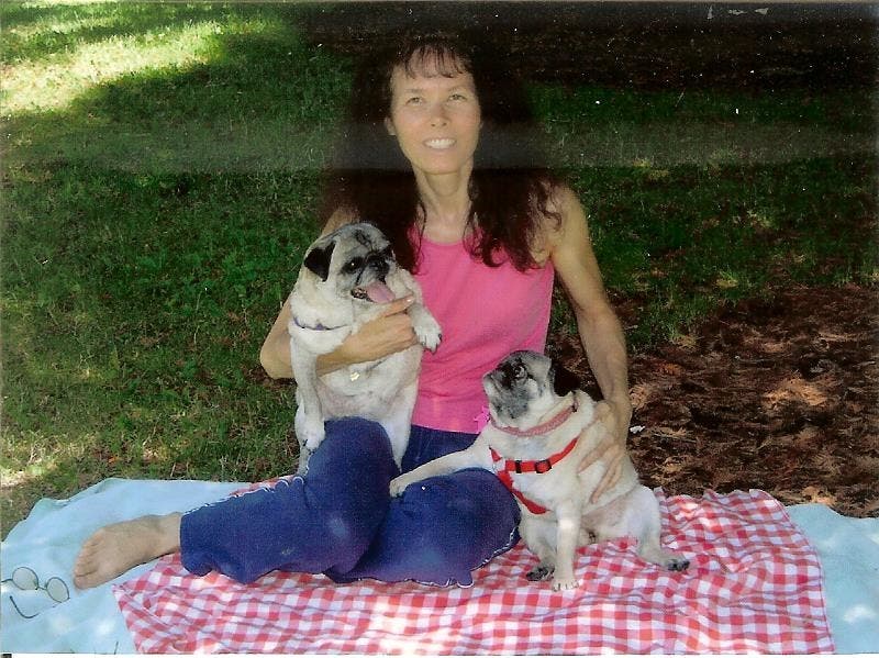 (Photo of me as doting Pug Mom with my beloved Elvira and Stella in 2005)