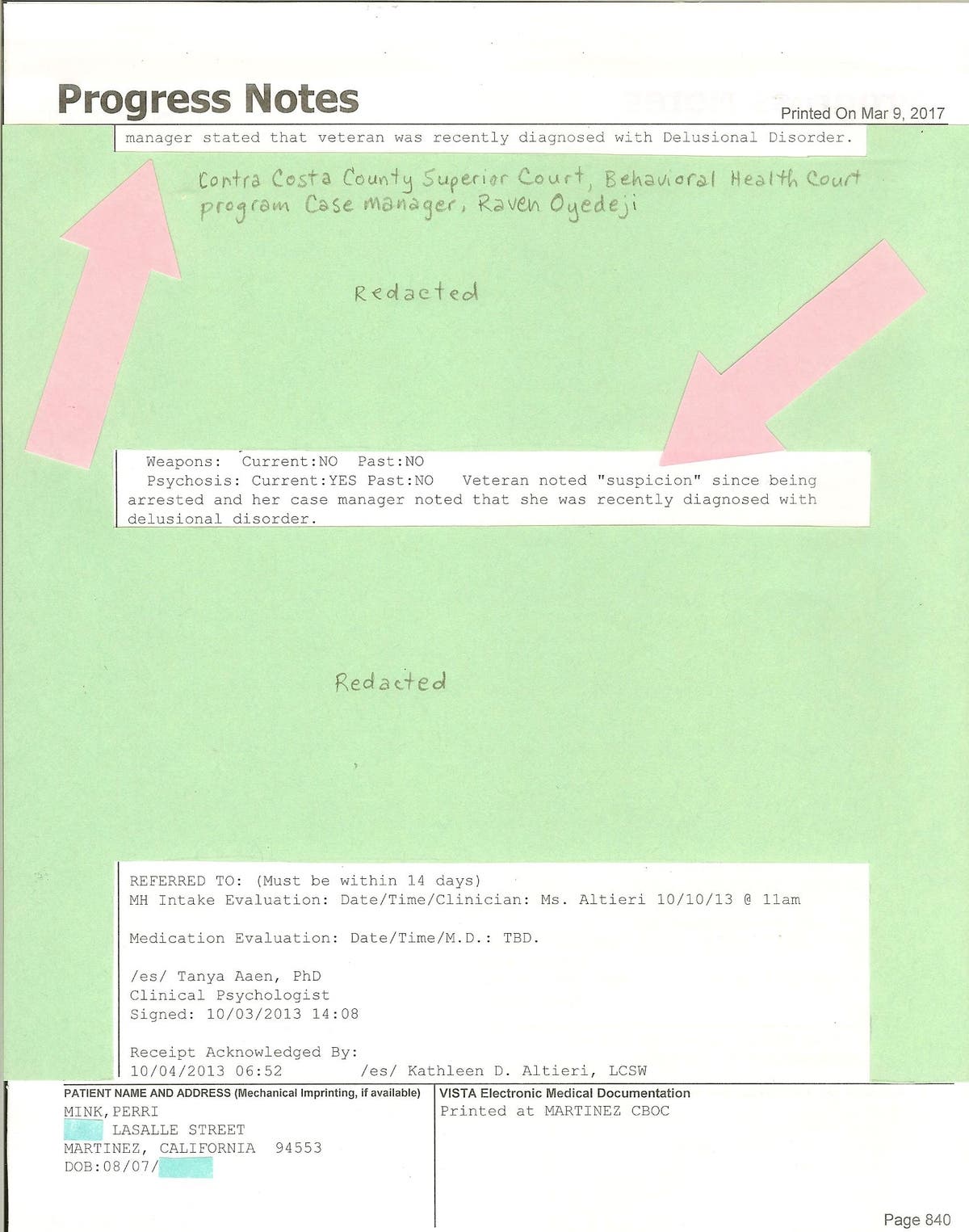 This first document is a copy of my Veteran's medical records for Intake with Mental Health based on the Contra Costa County Superior Court, Behavioral Health Court program Case Manager, Raven Oyedeji on October 3, 2013, just about a week or so after being released from West County Detention Facility, Richmond, California. At that early stage I'm "recently diagnosed with "Delusional Disorder.", and I have, "Psychosis: Current: Yes Past: No Veteran noted "suspicion" since being arrested and her case manager noted ...", per Behavioral Health Court program, source VA medical records printed on Mar 9, 2017 per my request for copies of my medical records on March 8, 2017. All of this word warping libeling is because I proved that I was defrauded by Encina Veterinary Clinic, Inc. et al in 2006, but was based on the letter I wrote to Judge Barbara Zuniga, a Catholic, Republican, "M" (Male) for gender, with a list of White Collar Crime Fighting I had succeeded in justice, not because I was looking for crime, but I was SHOCKED that the crime took place and found out, in some instances, 9 months after the crime took place. THAT'S NOT "SUSPICION", THAT'S FIGHTING FOR YOUR PROPERTY RIGHTS, CONSUMER RIGHTS, and CIVIL RIGHTS!