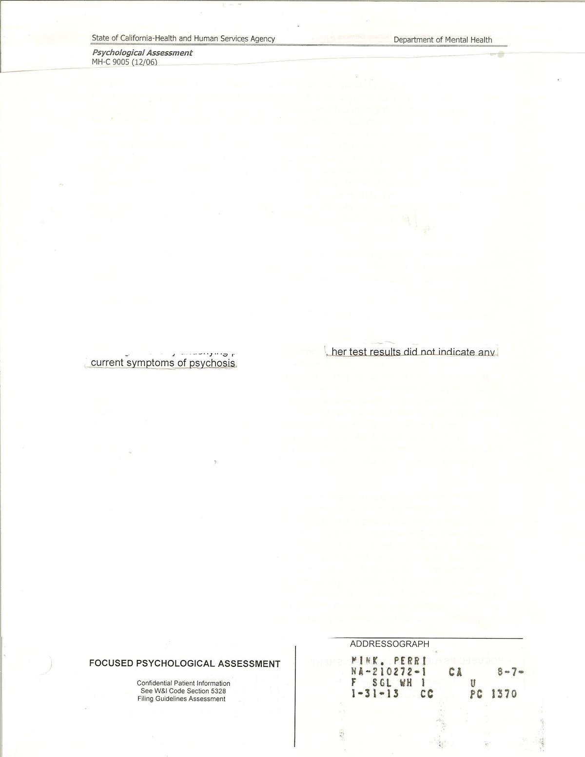 In my medical records from Napa State Hospital, where I was forced to in January 2013 by the Contra Costa County Superior Court judge from the Richmond, California courthouse, even though ALL THE Contra Costa County JUDGES WERE RECUSED ON September 18, 2012**, the document states, I have no Psychosis... This is dangerous psychology as the statements made by professionals is open ended, as if in one moment the target can have a mental illness of their choice or not. Notice how the diagnosis of Delusional Disorder in the VA medical records is under, "Psychosis", noted by the court case manager. THIS IS ALL JUNK PSYCHOLOGY, THIS IS ALL FRAUD PSYCHOLOGY!