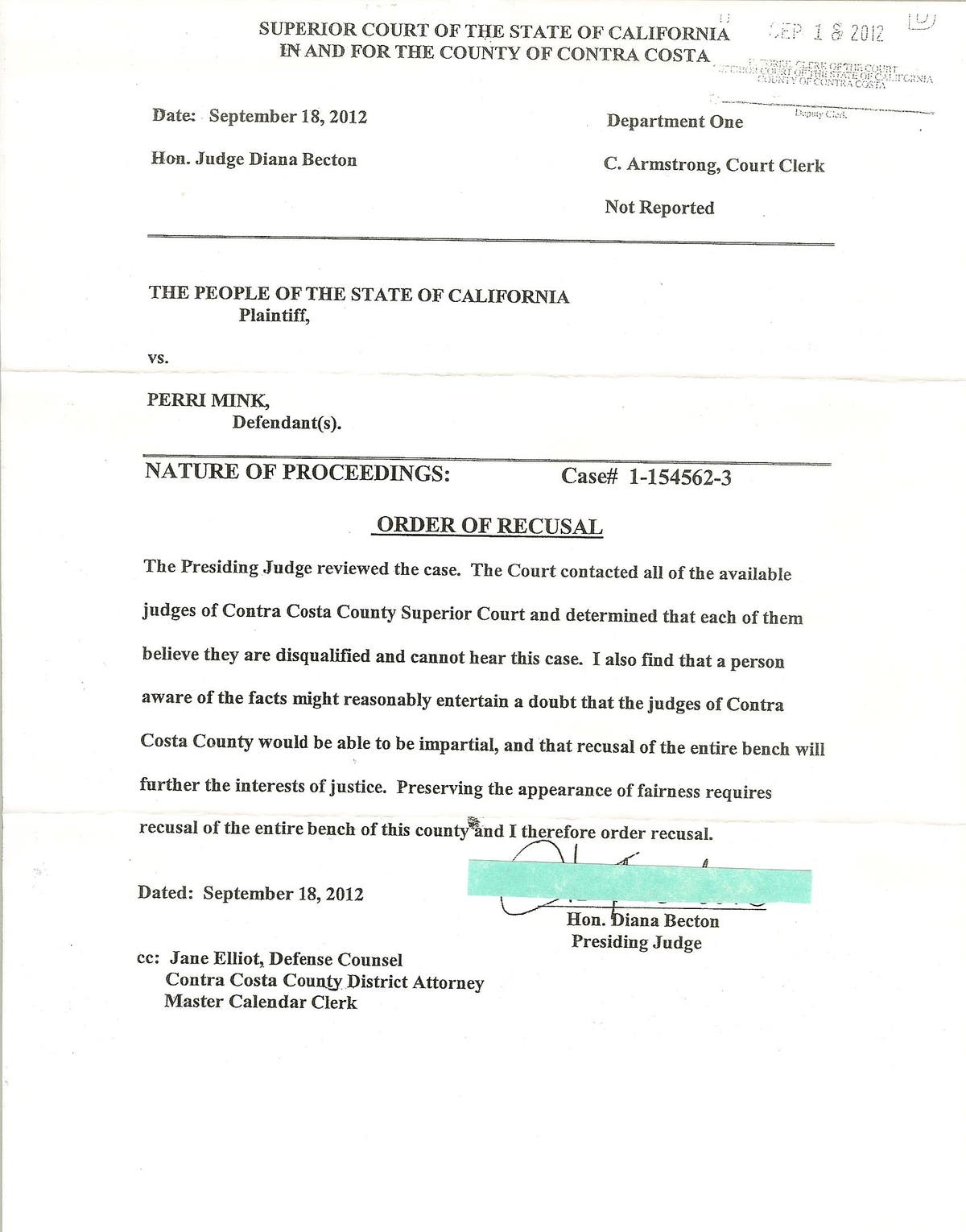 ** Recused Presiding Judge Diana Becton issued an illegal bench warrant on October 9, 2012. Under California Rule of Court 10.608(1)(a), a disqualified judge can not hear a case, the recused judge(s) can not make decisions until another judge has been assigned, therefore Becton's bench warrant is VOID, retaliatory, and criminal. I demand that Diana Becton be indicted and convicted for Destruction of a Witness, Obstruction of Justice, Intimidation, Wrongful Incarceration, Conspiracy, ...+! EVERY ASPECT of the Contra Costa County Superior Court's decisions are illegal and criminally and maliciously motivated! Jane Elliot told me that the recused judges can make "administrative" decisions - this is a lie!