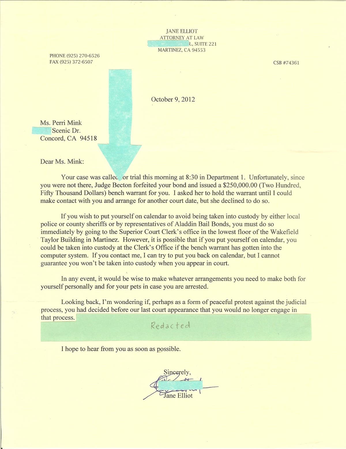 Prior to the issuing of PJ Diana Becton's illegal and barbaric bench warrant, I had contacted numerous government entities, as well as the bail bond company, government reporting agencies and "Bad blood" attorney Jane Elliot for conspiring to harass me, torture me, terrorize me, and deny me my rights, to no avail of stopping their destructive rampage. Photo below is a letter from attorney Jane Elliot informing me of the issued bench warrant, but never does she acknowledge that she conspired together with other government officials to destroy me, but instead claims I was "...peaceful protesting against the judicial process, ...", and they happily enjoy illegally kidnapping and cruelly hold me captive: