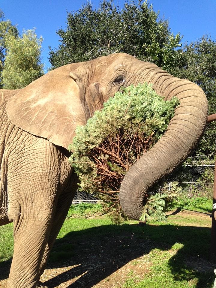 Image courtesy of Oakland Zoo on Facebook: Donna an African elephant enjoying a Christmas tree donated from Dale Pine and Crystal River Christmas Trees in Alameda.