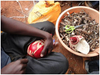 This man is carving the painted gourd so that a nativity scene may be placed inside.