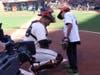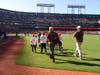 After hanging out in the dugout wearing new Giants T shirts and caps and clutching their new baseballs, the nine children stood at attention for the National Anthem and then ran out to the field to take the position to which each had been assigned.