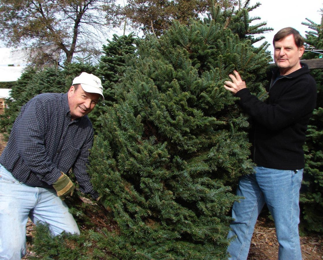 PHOTO: Bruce Wellings, outgoing Menlo Park Kiwanis Club President (left), handed the clubās leadership over to John Pinkston, long-time Kiwanis Club member and a past president. Both join the Clubās volunteers each year during the holidays at the Menlo Park Kiwanis Club Christmas Tree Lot in Palo Altoāto participate in the Clubās largest fundraising event.