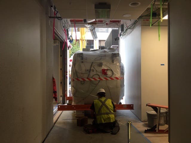 Because of their tremendous weight, the MRI machines are usually on the first floor of medical building. The two machines will be placed in the Radiology Department, replacing two older MRI units that have been temporarily operating in trailers parked outside of the campus during the construction.