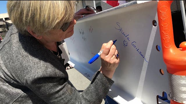 Sheila Gilson, senior vice president and area manager of the KP Redwood City Medical Center, also signed the beam with her name, the date, and then drew a little flower on the beam: