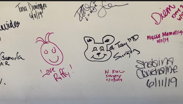 During the lunch hour, hundreds of Kaiser Permanente Redwood City doctors, nurses and staff signed their names and initials and a few cartoons on the beam, as part of a “Make Your Mark on Kaiser Permanente Redwood City History” celebration.