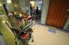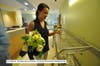 Sara knocks gently on each door at Kaiser Permanente Redwood City, asks with a smile if she can come in; the patients usually say yes, and Sara goes into the room carrying the floral arrangement.