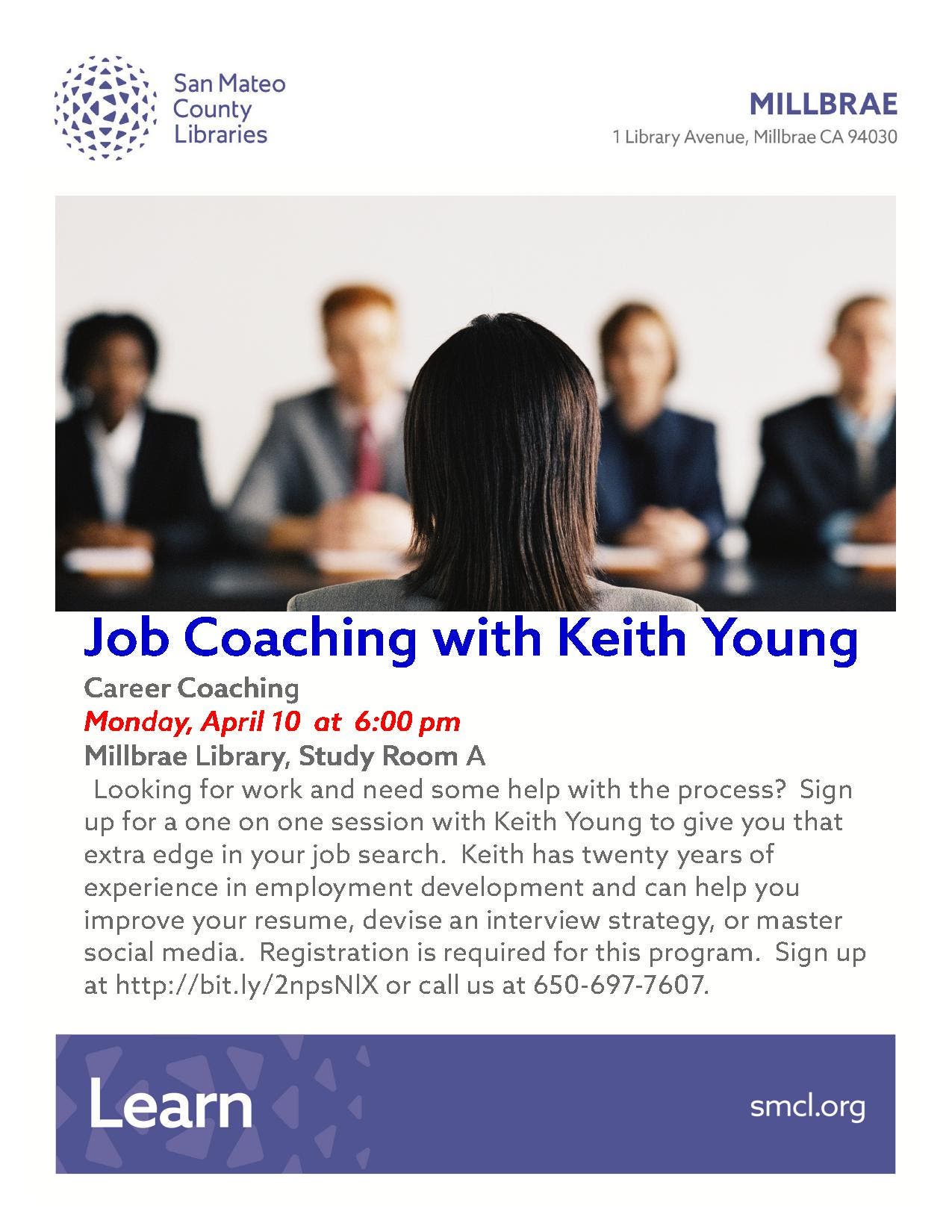 Looking for work and need some help with the process? Sign up for a one on one session with Keith Young to give you that extra edge in your job search. Keith has twenty years of experience in employment development and can help you improve your resume, devise an interview strategy, or master social media. Registration is required for this program. Sign up at http://bit.ly/2npsNlX or call us at 650-697-7607.