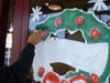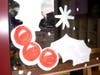 Using just two small line brushes and a pair of two-inch paint rollers, Regua created a festive winter tableau on the shop’s two entry doors and three picture windows. The doors boast a colorful, leafy-green holiday wreath dotted with red berries and wrapped in bright red ribbons, with a “Happy Holidays” message. The shop windows were filled with snowflakes and leaves of holly.