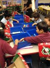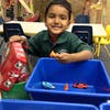 Preschool and elementary school students sort toys and assemble boxes to provide gifts for children in need
