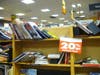 The books on some shelves, like a few in the transportation section, have fallen in on each other forming a slanted hill of discount wares.