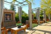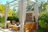Outside, on the exquisitely landscaped Orchard Terrace, five 30-inch-by-30-inch framed works serve as focal points for curtained couch-and-chair seating areas.