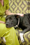 Kare is about 65 lbs. , 3 years old, is spayed, house-trained, and up-to-date with her vaccines. Her primary color is black, with white on her chest and feet.