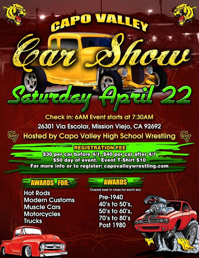 The Capo Valley Car Show, hosted by Capo Valley Wrestling will be on Saturday April 22, from 7:30 am until 11 am in the Capistrano Valley High School parking lot.