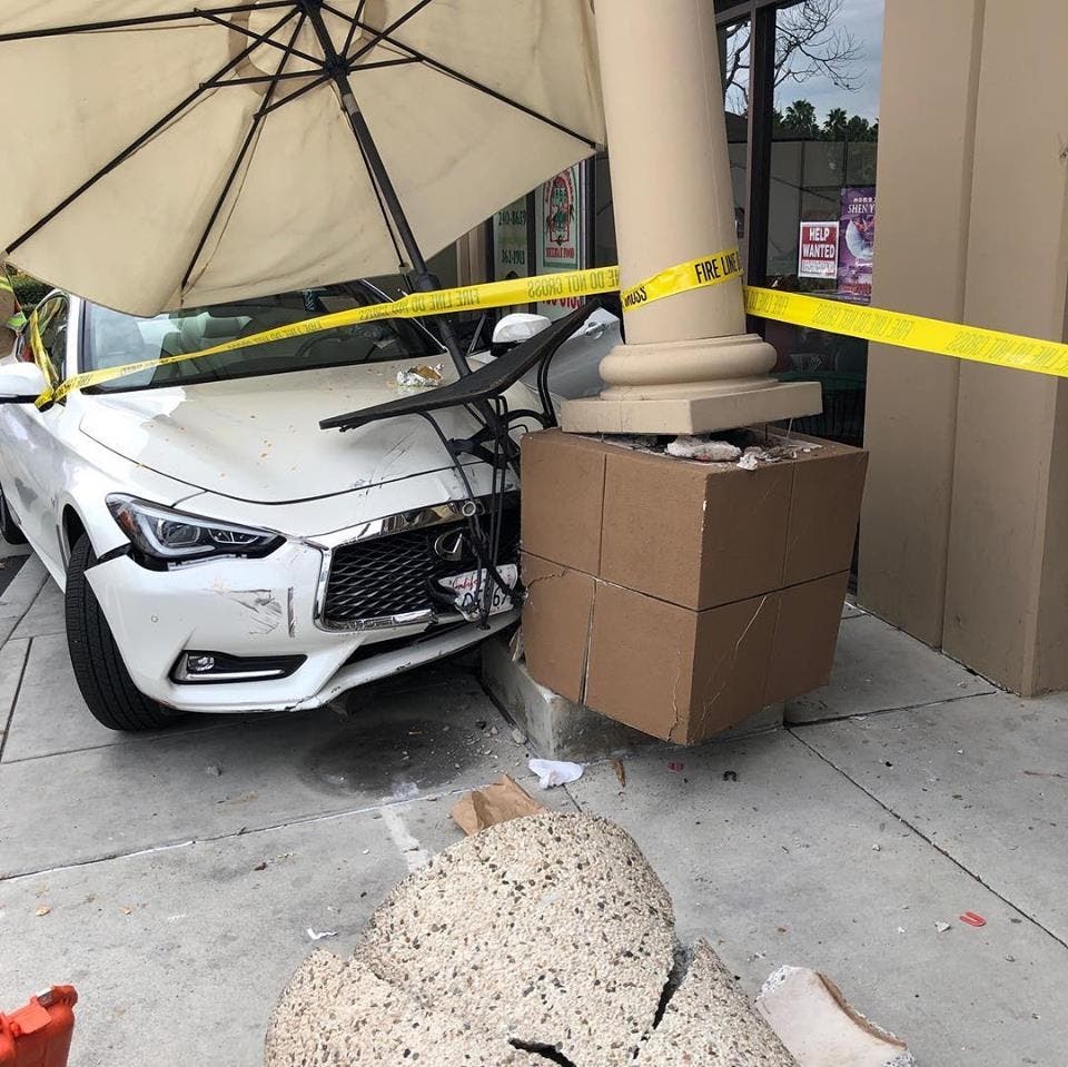 It was mid-afternoon, and local diners were outdoors eating Mexican fare when the white Infinity sedan careened up and over the sidewalk. The vehicle struck a pedestrian, destroyed a cement trash enclosure and caused what could be severe damage to the strip mall store, according to police.