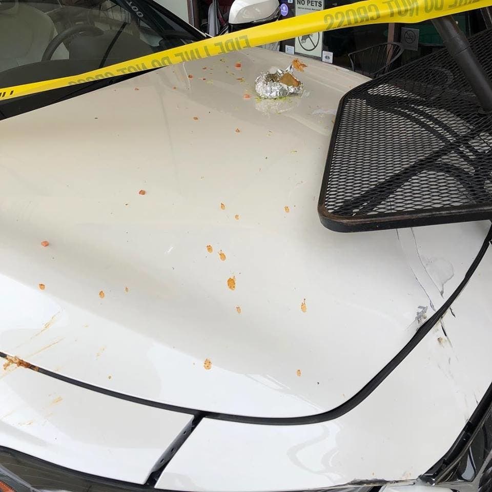 There were people outside of the popular eatery, Los Golondrinas, located on the 25800 block of Jeronimo Road, when the car struck, evidenced by the half-eaten burrito, or possibly taco, and the smear of salsa left across the vehicle's damaged front end.