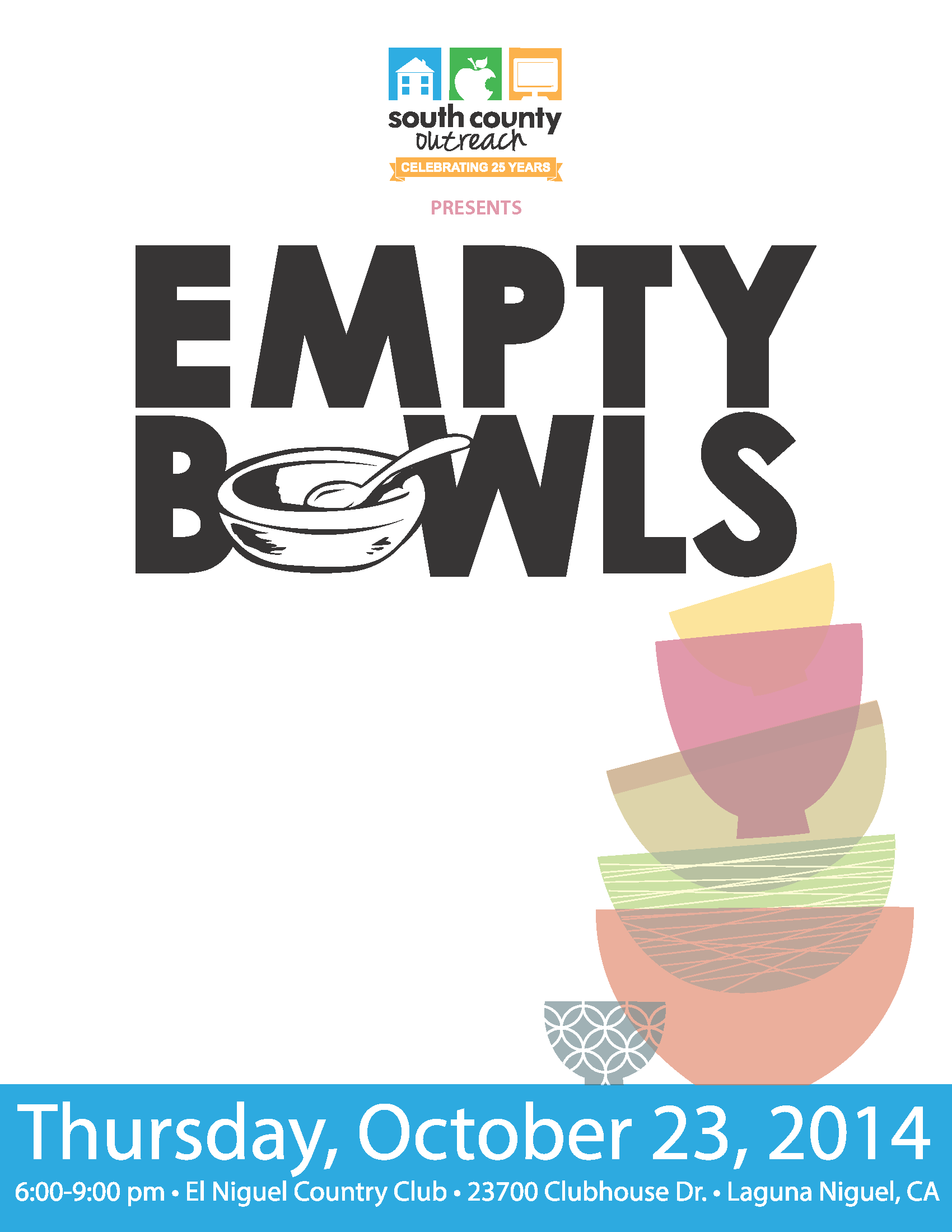 Based in Irvine, South County Outreach serves the communities of Aliso Viejo, Dana Point, Irvine, Laguna Beach, Laguna Hills, Laguna Niguel, Laguna Woods, Lake Forest, Mission Viejo, Rancho Santa Margarita, San Clemente and San Juan Capistrano. The Empty Bowls event takes place in Laguna Niguel.
