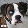 Luna is unique in her looks. You cannot help but take notice of her one blue eye. You do not see many blue eyed Boxers, but just look at Luna. She loves people and has lived with her favorite kind of people: kids!. She came from a home that had too many dogs, but if you asked Luna she would have said “no big deal”. Luna will do best in a home with another dog as a companion but she has been loving life as the center of attention as the only dog in a busy family. Luna is housebroken and also great with kids. A stay at home mom with a revolving door of home activities would be heaven for Luna. She is easy to walk on leash and knows her basic commands. A big family that keeps her busy along with another dog at home would be perfect for this little blue eyes busy body.