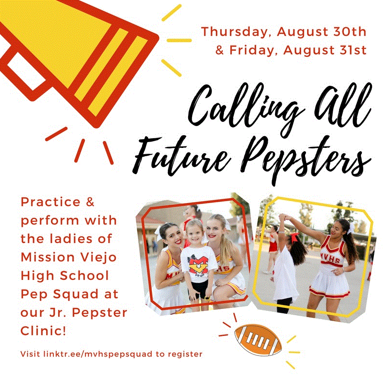 Learn Football Cheers, Perform at Half Time, Receive a Pep Squad Bow and T-Shirt, Enjoy Dinner with MVHS Pep Squad.