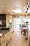 Lighting was an important aspect of this remodel. A new skylight was created using the hole in the roof from the old grill. We installed new LED down lights in the ceiling, three LED glass pendants over the breakfast bar, and LED under-cabinet strip lights for tasks on the countertop areas. The two reed glass door cabinets also received interior LED strip lights. This provides white light that is energy efficient and will last for many years.