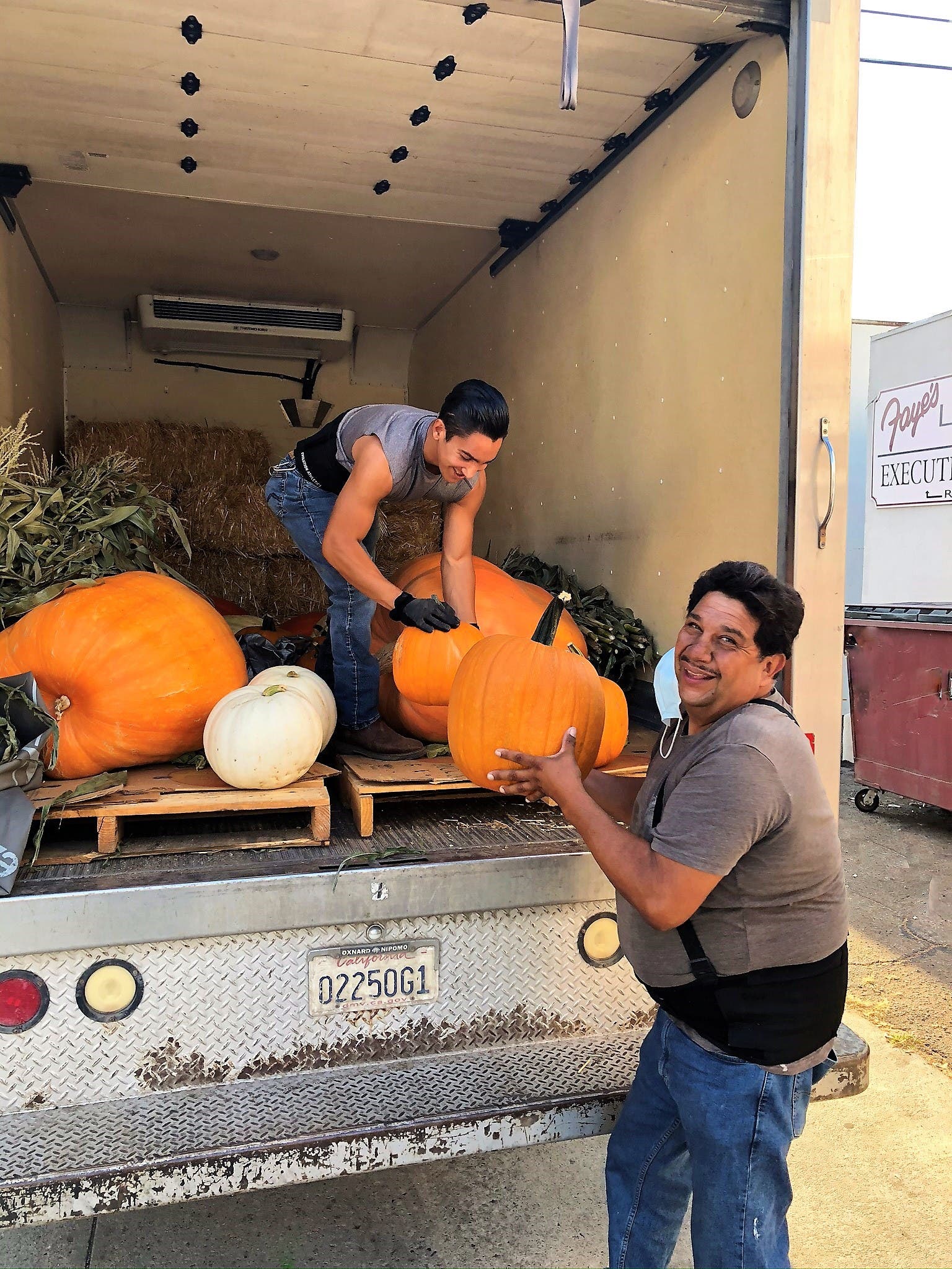 The giant pumpkins weigh between 200 and 400 pounds and take four men to lift them off the truck! To round out the assortment several large orange and white pumpkins and corn stalks are lined up in the staging area.