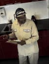 The suspect is described as a man between 50 to 65 years old, 5 feet 7 to 9 inches, 170 to 180 pounds, wears glasses, has brown hair and mustache. He wears a khaki uniform with patches that say 'Larry' and 'Hawthorne CAT.' He also carries a clipboard.