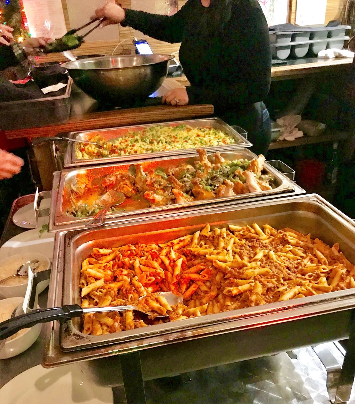 Guests enjoyed pasta, baked chicken, saffron rice, and a healthy salad.
