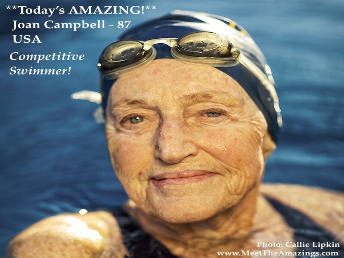 Joan Campbell, at 87, is a competitive swimmer with US Masters Swimming. Since she turned 80, she has placed in the top 10 competitors in – wait for it – 307 events. Considering Joan only took up swimming seriously at 59, that’s quite something. To boot, she holds world records in her age group in the 200 and 800 meter short course relay with her relay teammates. Joan competes about once a month, because – as she puts it - having that goal helps her stay focused and motivated.