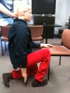 B. From this kneeling position, slowly rise and turn your body/ hips to sit in the chair.