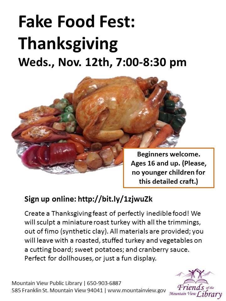 Create a Thanksgiving feast out of clay on Wednesday, 11/12/2014 from 7:00 - 8:30 PM at the Mountain View Public Library.