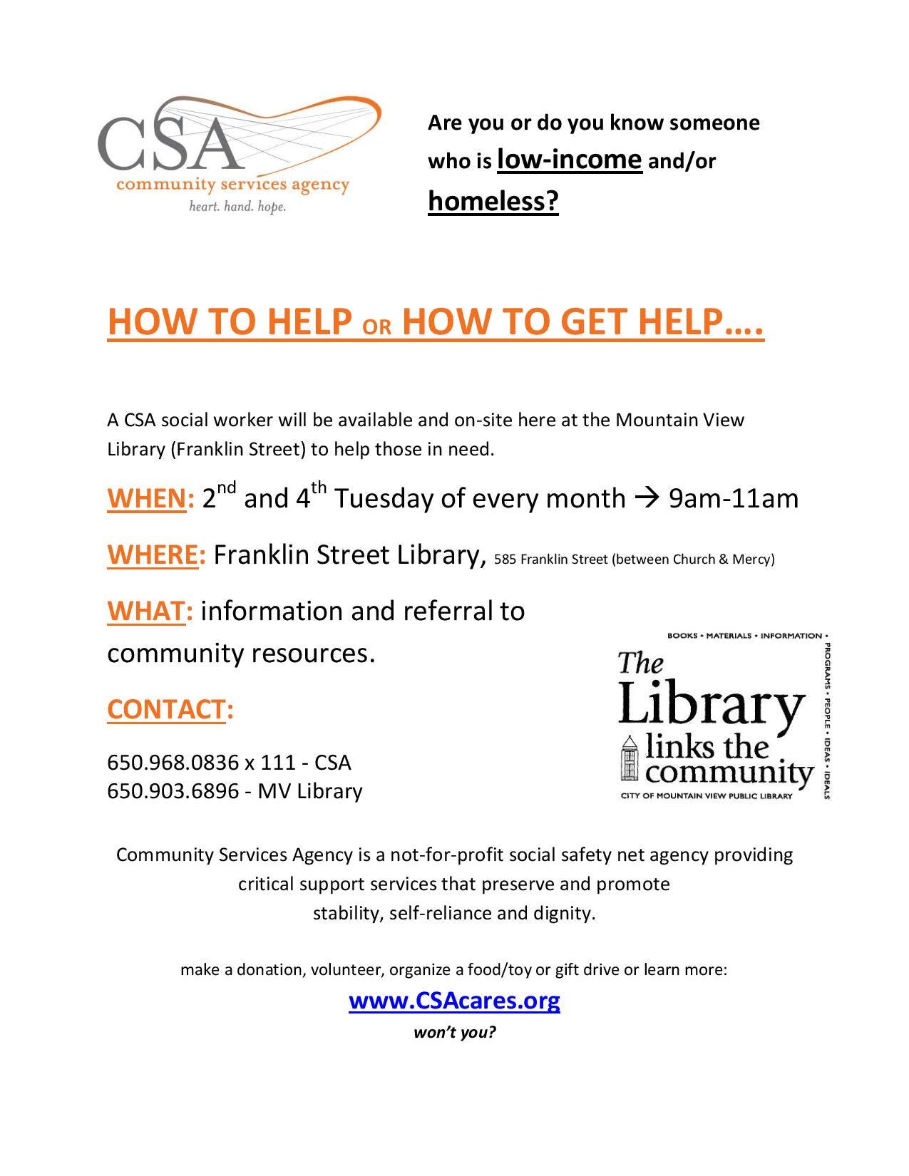 On the 2nd and 4th Tuesday A CSA social worker will be available and on-site here at the Mountain View Library to help those in need. Get information and referrals to community resources. Drop-in, no registration required.