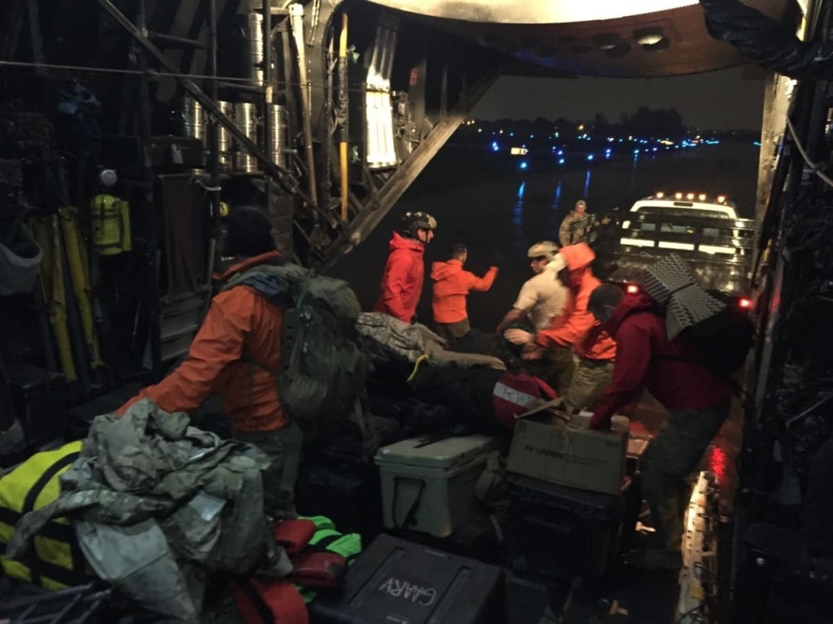 Photo: U.S. Air Force Guardian Angel pararescuemen from the 212th Rescue Squadron, Alaska Air National Guard, unload their equipment from an MC130P Combat Shadow aircraft assigned with the 129th Rescue Wing, California Air National Guard at Miami Opa Locka Executive Airport, Florida as Hurricane Irma approaches, September 9, 2017. The Guardian Angel team are prepositioning themselves and staging equipment 20 miles outside of Miami in a safety bunker rated for a Category 5 hurricane in order to have immediate capability once the storm passes to begin personnel recovery operations. (U.S. Air National Guard photo by Tech. Sgt. Joseph Prouse/129th Rescue Wing)