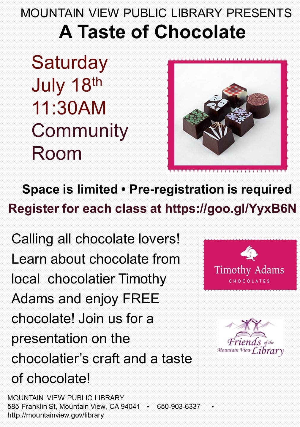 Calling all chocolate lovers! Learn about chocolate from local chocolatiers and enjoy FREE chocolate! Chocolatiers will offer a presentation on their craft and answer all your chocolate related questions.