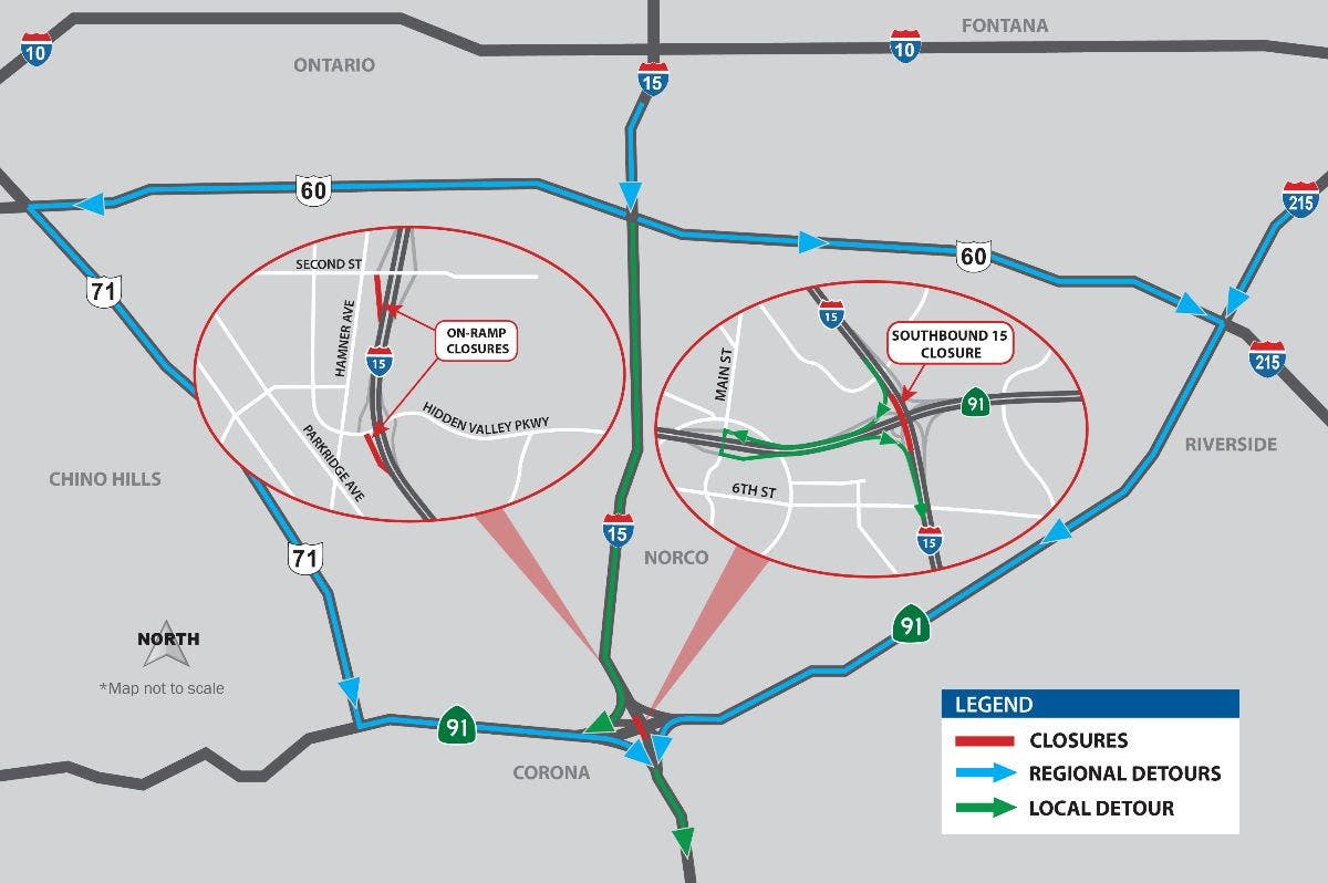 Regional detours will be available on state Route 60, state Route 71, or Interstate 215 to connect to southbound I-15. Motorists who must travel on southbound I-15 near the closure area can follow local detours using Main Street, Hidden Valley Parkway, or Second Street, the agency said. See a detour map below.