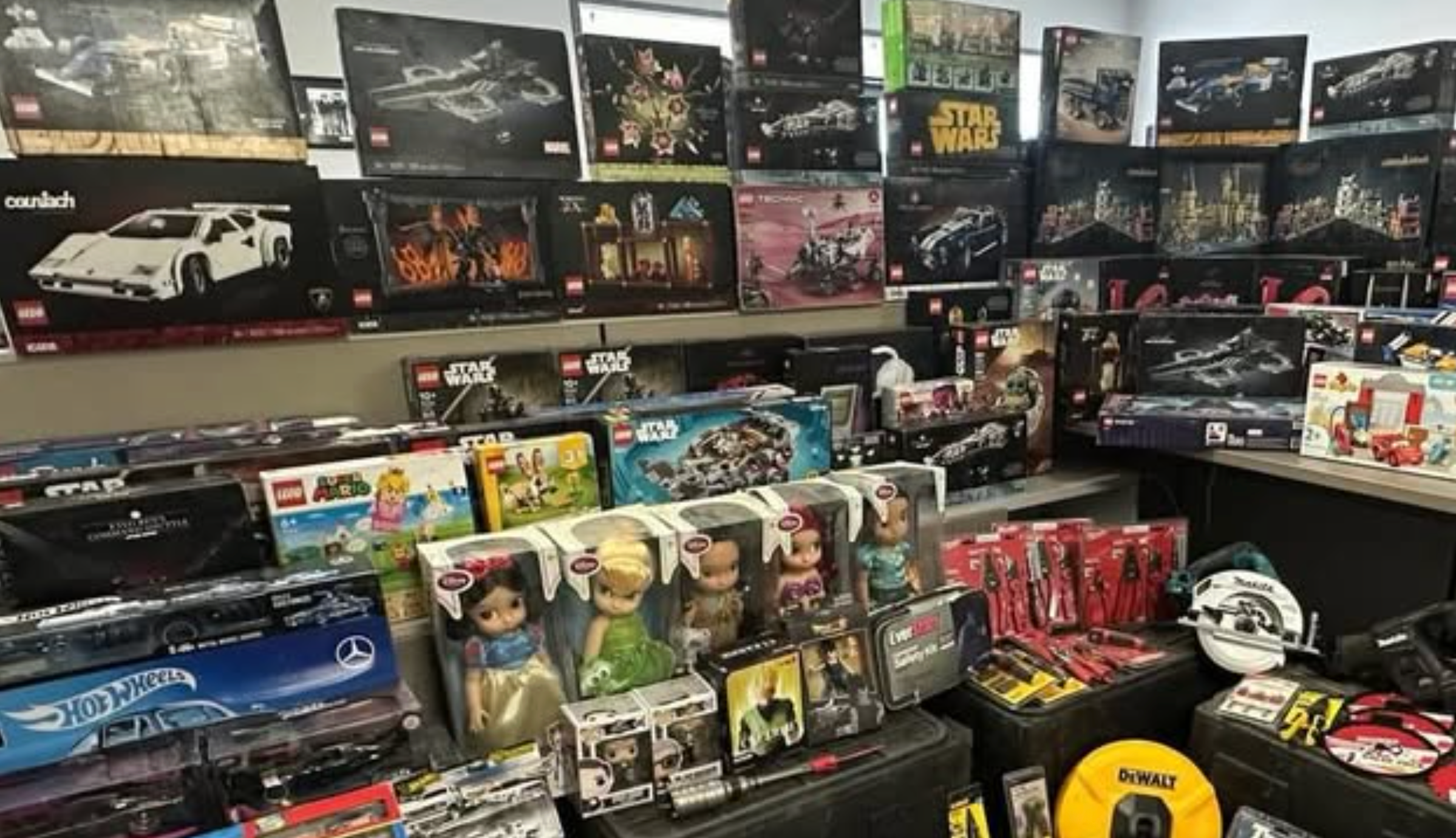 Recovered items included Star Wars-themed sets, Lego Friends sets, Duplo Legos, Technic sets, numerous race cars and Hotwheels, as well as boxed Disney princess dolls, Funko Pop dolls, and power tools.
