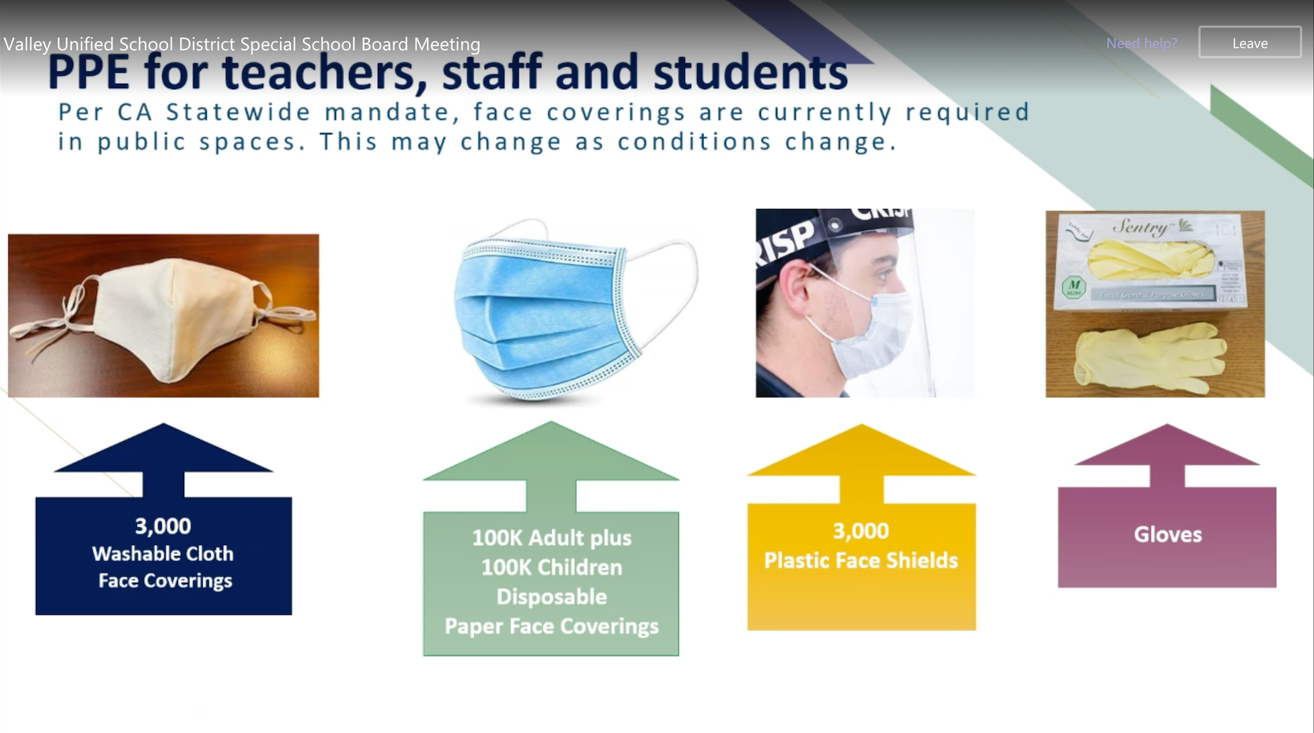 Per the governor, everyone will wear masks or face shields at school campuses. Students younger than 3rd grade are not mandated to wear masks or shields, but are encouraged to do so. The following shows what the MVUSD is prepared to provide.