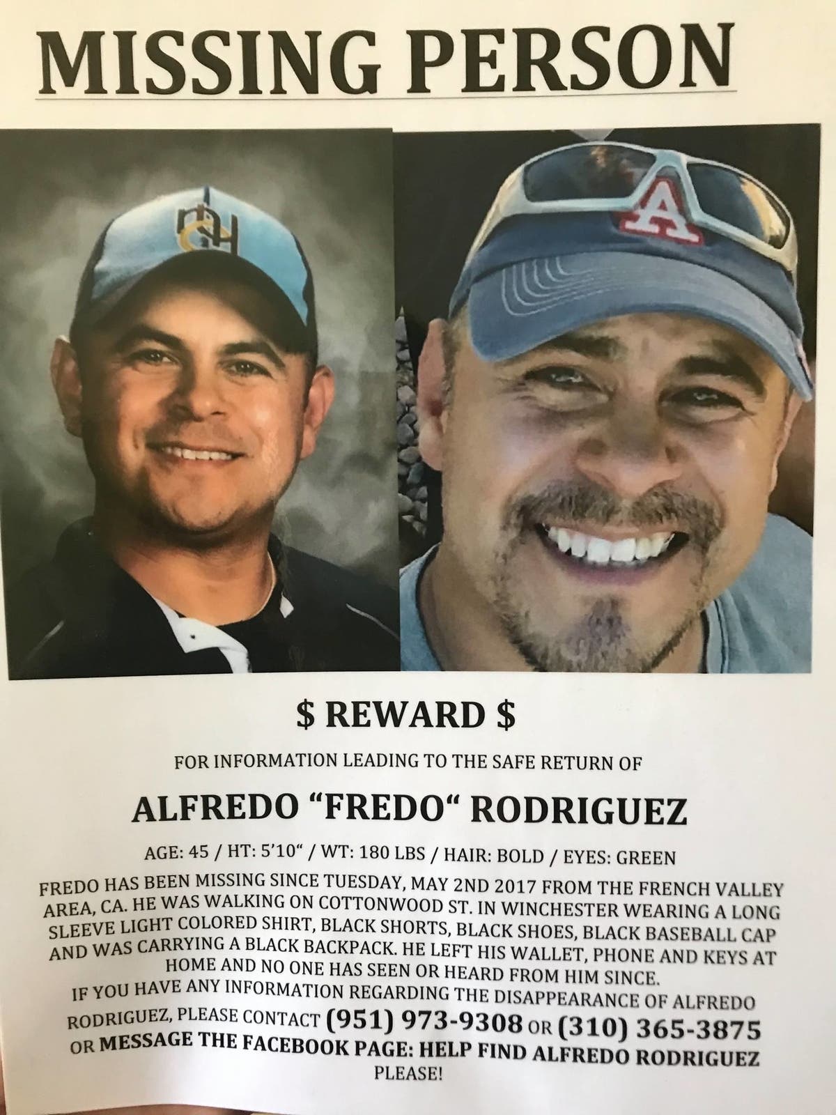 "The wife, children and family of Alfredo Rodriguez will be speaking to the volunteers and community in the French Valley area," a community announcement states. "The purpose of this gathering is to provide information about the ongoing search for Alfredo, provide flyers to those wishing to help spread the word and to thank the FV community for the support and assistance in bringing 'Fredo' home."