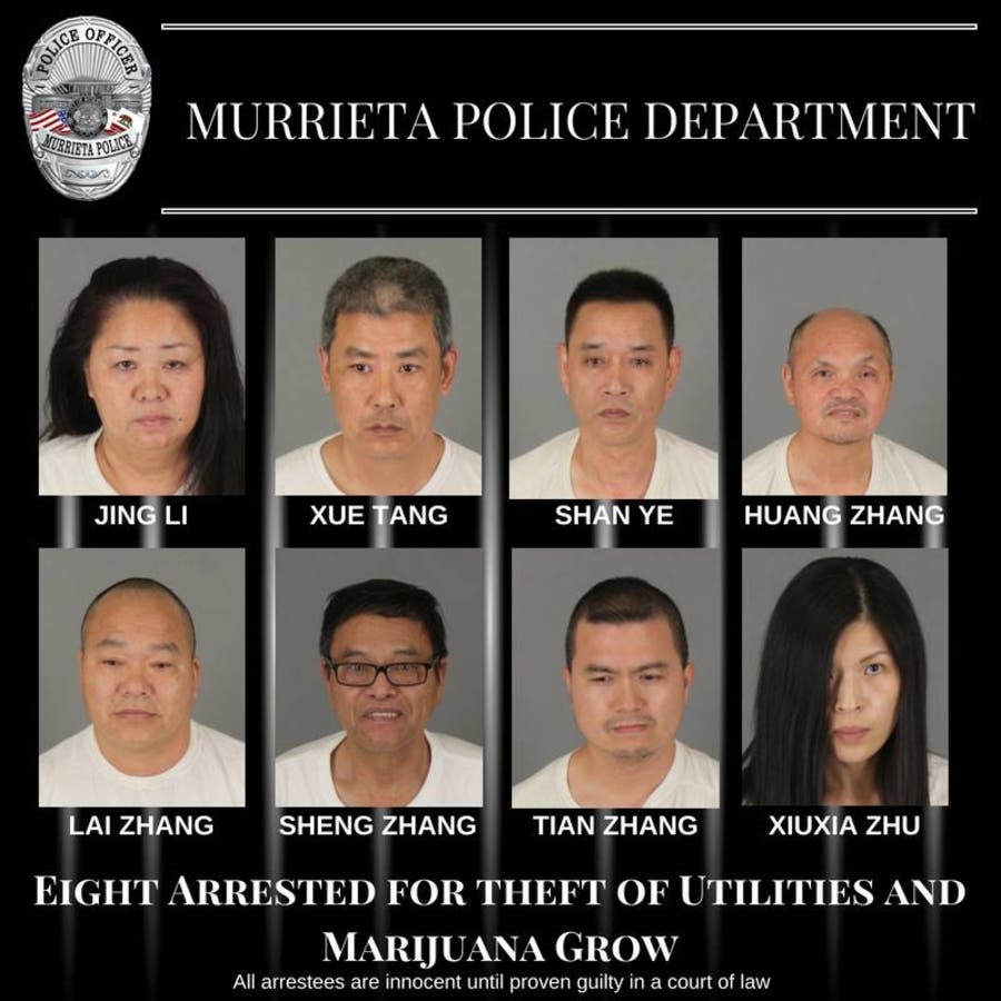 Jing Li, 37, Xue Geng Tang, 41, Shan Ye, 41, Huang Zi Zhang, 63, Lai Zi Zhang, 49, Sheng Zhong Zhang, 65, Tian Zhang, 43, and Xiuxia Zhu, 38, were arrested Friday afternoon following a Murrieta police investigation that began last month.