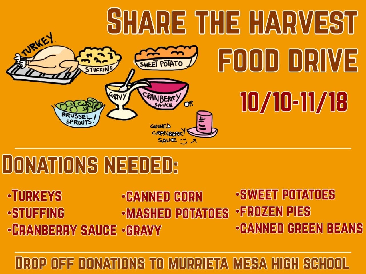 You can drop off donations at Murrieta Mesa High School: 24801 Monroe Avenue, Murrieta, CA.