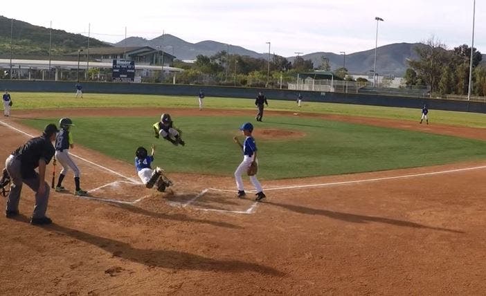 Youth ballplayer Devin Avedissian shows off his athleticism by leaping above the catcher’s reach, to land on the home plate, scoring his team a run on March 29, 2015. Screenshot via YouTube.