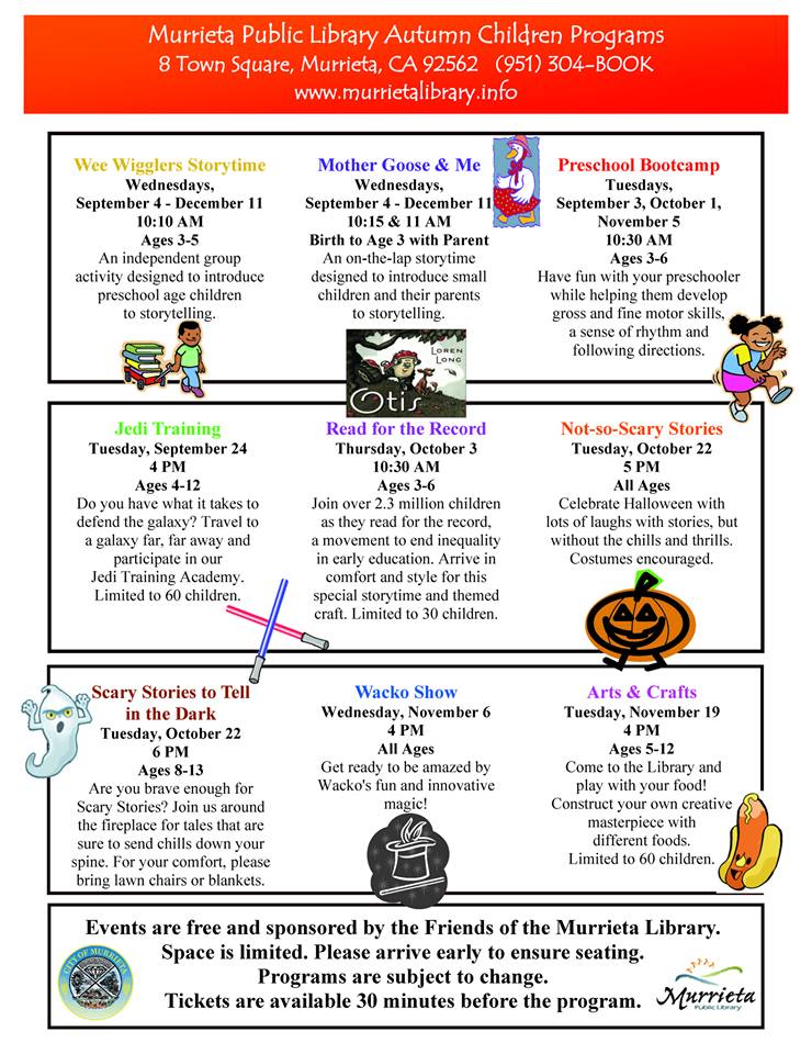 Library website: http://www.murrieta.org/services/lib/ or call 951-304-BOOK (2665) for more information.