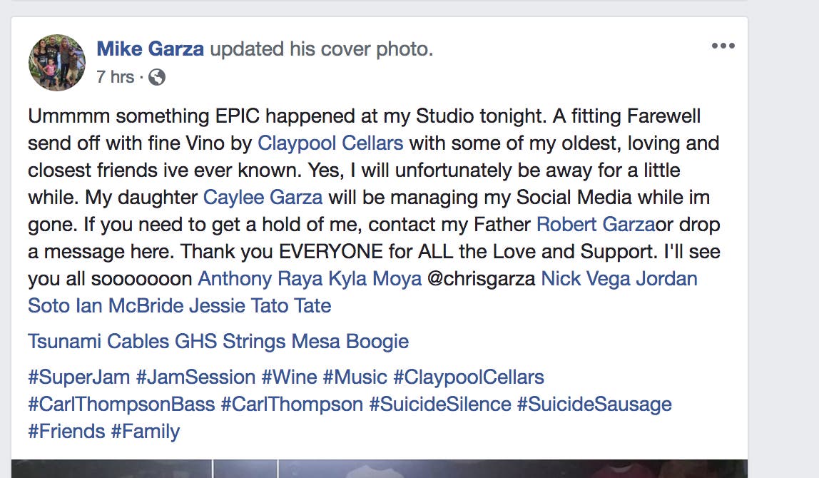 Garza posted details about the gathering on Facebook, thanking friends for an “epic” and “fitting farewell” at his studio. “Yes, I will unfortunately be away for a while … I’ll see you all sooooooon,” the post said. In a reply to a comment from someone who said “hope all’s OK,” Garza wrote, “It will be brutha. Just gotta handle some shit. I’ll be back!!! I promise.”